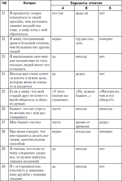 Инструкция. Перед тобой 42 вопроса и по три варианта ответа на каждый из них: «А», «Б» или «В». Отвечая на каждый вопрос, выбери один из этих вариантов – тот, который в большей степени соответствует твоим представлениям о себе. Старайся как можно реже прибегать к промежуточному, неопределенному варианту «Б». Помни, что здесь нет и не может быть правильных или неправильных ответов: все люди разные, и каждый может высказать индивидуальное мнение. Отвечай искренне и точно, не обдумывая долго варианты ответов. Отмечай тот ответ, который первым приходит в голову.
