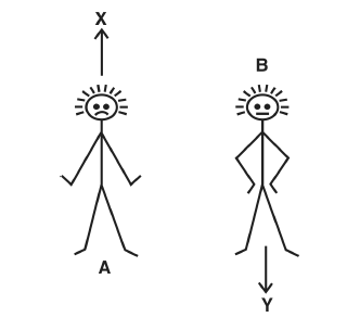 Человечки на этом рисунке символизируют двух реальных людей из плоти и крови, которых мы будем называть А и В. Каждый из людей, которых обозначают А и В, обладает неким личным и эксклюзивным знанием, то есть знанием, которым не обладает другой. Действительно, с нашей точки зрения внешнего наблюдателя мы видим, что в этом случае «существует» знание, которым не обладает внешний наблюдатель, и что оно рассеяно между А и В, в том смысле, что частью его обладает А, а другой частью – В. Предположим, например, что информация, которой владеет А, состоит в том, что он планирует достичь цели X (эту цель обозначает направленная на X стрелка над его головой), и у него есть конкретное практическое знание, значимое в контексте его деятельности (набор практических знаний или информации обозначен лучиками вокруг головы А), чтобы помочь ему в этом. У В похожая ситуация, за исключением того, что он преследует совершенно иную цель Y (ее обозначает стрелка, направленная от его ног к Y). Набор практической информации, которую действующий В считает значимой в контексте своей деятельности, деятельности ради достижения Y, также изображен лучиками вокруг его головы.