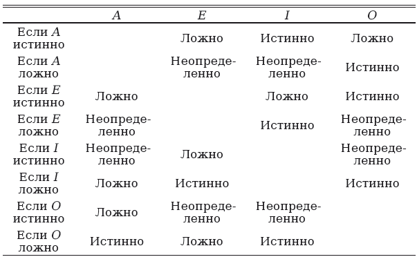 Данные отношения между категорическими суждениями были представлены в древнем квадрате противопоставлений1. Мы также можем построить следующую таблицу обоснованных выводов из каждого из четырех видов категорических суждений.