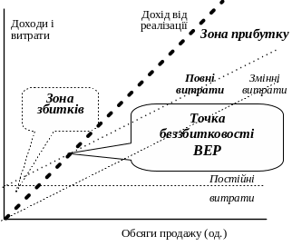 Точка беззбитковості — це мінімально припустимий обсяг реалізації продукції (в натуральному, або грошовому вимірі), достатній для покриття сукупних витрат підприємства.