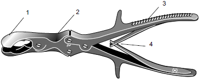 Рис. 32. Основные элементы конструкции костных щипцов (кусачек): 1 – губки с режущими кромками; 2 – винтовой замок; 3 – рукоятки с усиливающими упорами; 4 – пластинчатая возвратная пружина (по: Medicon instruments, 1986).