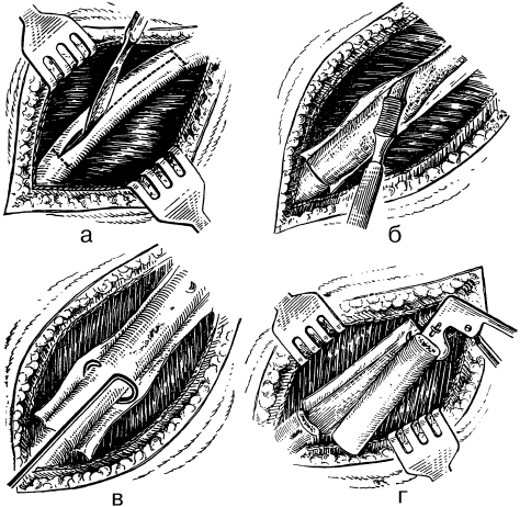 Рис. 36. Этапы резекции ребра: а – рассечение надкостницы на внешней поверхности ребра; б – отслаивание надкостницы с верхнего и нижнего краев ребра с помощью распатора фарабефа; в – отслаивание надкостницы с помощью реберного распатора Дуайена; г – пересечение ребра с помощью ножниц Пиртца (Лопухин Ю. М., Молоденков М. Н., 1968).