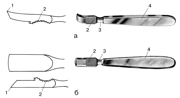 Рис. 34. Основные конструктивные элементы общехирургического распатора: а – изогнутый распатор фарабефа; б – прямой распатор фарабефа. 1 – рабочая кромка; 2 – опорная площадка; 3 – шейка; 4 – рукоятка (по: Medicon instruments, 1986).