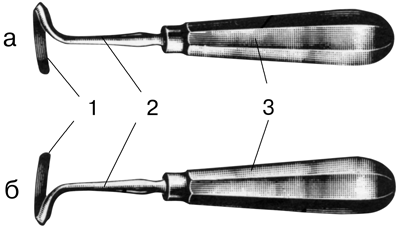 Рис. 35. Основные элементы конструкции реберного распатора: а – правый реберный распатор; б – левый реберный распатор; 1 – рабочая часть (лезвие); 2 – шейка; 3 – рукоятка (по: Medicon instruments, 1986).