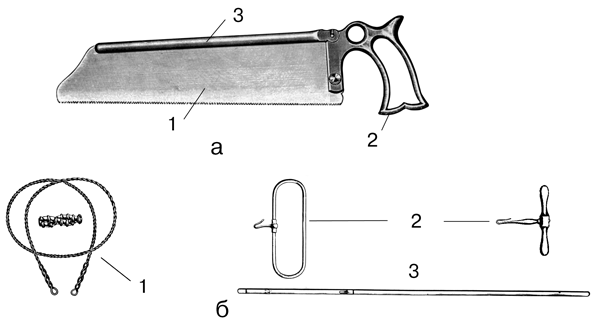 Рис. 39. Различные конструкции хирургических пил: а – листовая пила: 1 – лезвие; 2 – рукоятка; 3 – направляющая конструкция для придания лезвию жесткости. б – проволочная пила: 1 – проволочная пила Джильи; 2 – ручки для проволочной пилы; 3 – проводник Поленова для защиты прилегающих к кости тканей.
