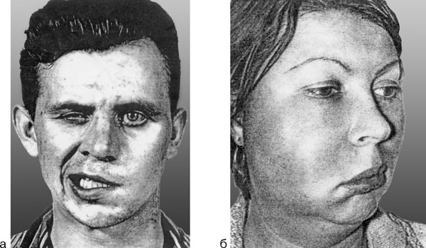 Рис. 3. а – маскообразное лицо при параличе мимических мышц (по: Каверина В. В., 1967). б – выраженная припухлость при флегмоне щечной области справа (по: Шаргородский А. Г., 1985).