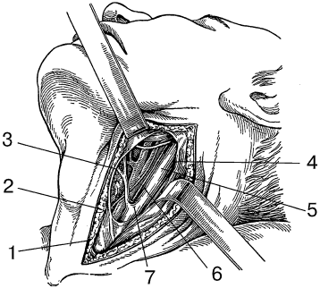 Рис. 5. Слои, определяемые в линейной ране при обнажении наружной сонной артерии:! – кожа; 2 – подкожная жировая клетчатка; 3 – подкожная мышца шеи; 4 – грудино‑ключично‑сосцевидная мышца; 5 – внутренняя яремная вена; 6 – блуждающий нерв; 7 – наружная сонная артерия (по: Лопухин Ю. М., Молоденков М. Н., 1968).