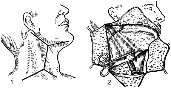 Рис. 6. Стратиграфическая последовательность действий при выполнении шейной лимфаденэктомии (операции Крайля) лоскутным способом: 1 – направления разрезов кожи перед выкраиванием лоскутов; 2 – рассечение поверхностной фасции и подкожной мышцы шеи над верхним краем ключицы от грудины до трапециевидной мышцы. Обнажение ножек грудино‑ключично‑сосцевидной мышцы. Выделение клетчатки бокового треугольника шеи. Пересечение ножек грудино‑ключично‑сосцевидной мышцы (по: Пачес А.И., 1987).