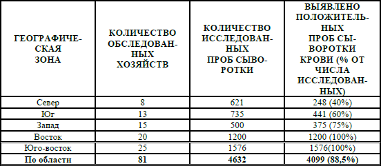 Анализ результатов серологических исследований показывает, что ИРТ КРС распространён, в основном, в Восточных и Юго‑восточных районах Свердловской области, где инфицированность животных достигает 100 %. В этих районах имеется импортированный скот, отмечается высокая концентрация животных, высокая интенсивность ведения животноводства и широкий охват животных искусственным осеменением.