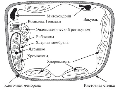 Обобщенная растительная клетка. Клетка имеет три основные части: 1) поверхностный аппарат, окружающую клетку; 2) цитоплазму, содержащую воду, соли, органические соединения и органеллы; 3) клеточное ядро, в котором находится генетический материал (ДНК).