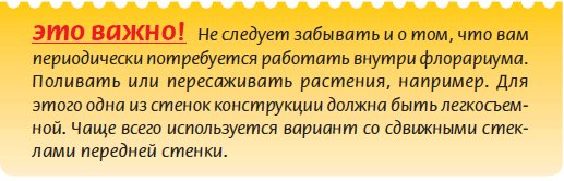 Исходя из конкретных условий, можно выбрать и другие варианты, например «сад в бутылке», флорариум‑тумбу, настенный, угловой. А можно разработать и свой, ни на чей не похожий. Приступая к проектированию флорариума, следует продумать многие детали. Его размеры и выбор конструкции в первую очередь будут зависеть от той площади, которую вы сможете выделить для него в своей комнате. По возможности всегда стремитесь к максимально возможным габаритам, так как этим вы снимете ограничения при выборе ассортимента растений.