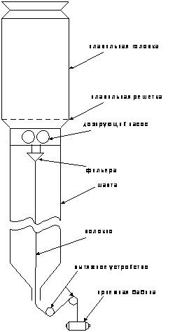 Гранулы полимера в данной схеме поступают в плавильную головку, далее расплав полимера продавливается через фильеру с помощью дозирующего шестеренчатого насоса и поступает в шахту, где нить охлаждается и затвердевает под действием вытяжения и наматывается на приемную бобину.