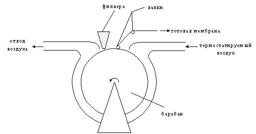 Профильтрованный, обезвоздушенный и нагретый раствор полимера продавливают через щелевую фильеру на полированную боковую поверхность цилиндрического барабана. В цилиндрический кожух вокруг барабана противоположно вращению подается воздух или другой газ контролируемой температуры и влажности, внутри барабана расположена полость, в которую также подается теплоноситель для термостатирования. Таким образом, воздух и полимерная лента мембраны движутся противоточно, что обеспечивает равномерность испарения растворителя. Готовая плоская мембрана в дальнейшем сматывается в рулон.
