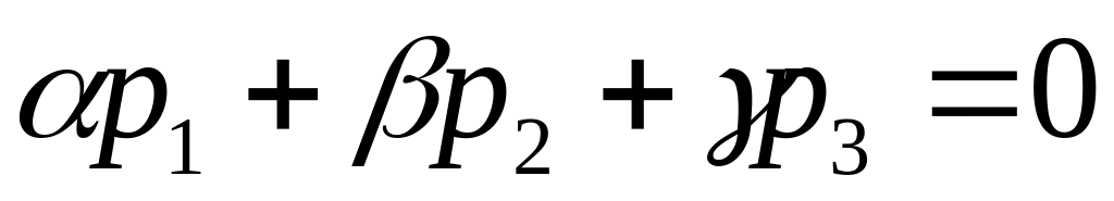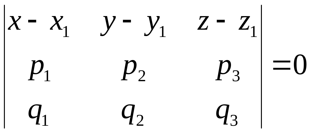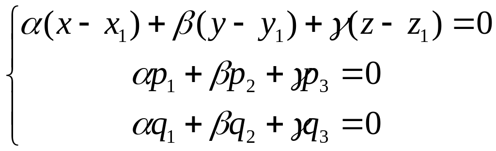 Система уравнений (10)является системой линейных одноородных уравнений относительно неизвестных координат вектора нормали плоскости δ. Она имеет ненулевое решение, если определитель системы равен нулю. Таким образом, для плоскости, проходящей через точку М0 параллелно векторам и должно выполняться условие