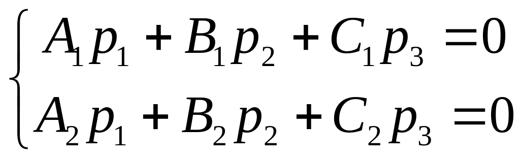 Для определения координат направляющего вектора прямой, заданной уравнениям (19), заметим, что направляющий вектор прямой параллелен как плоскости α, так и плоскости β. Это означает, что координаты направляющего вектора прямой должны являться решением системы уравнений