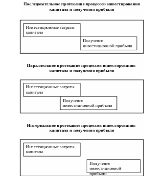 При последовательном протекании инвестиционного процесса инвестиционная прибыль формируется сразу же после завершения инвестирования капитала; при параллельном его протекании формирование инвестиционной прибыли возможно еще до полного завершения процесса инвестирования капитала; при интервальном его протекании между периодом завершения инвестирования капитала и формированием инвестиционной прибыли проходит определенное время.