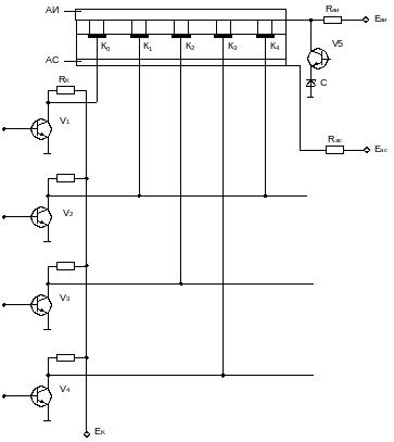 Принцип работы панели для простоты покажем на примере функционирования одной строки, показанной на рис.5.6. Анод сканирования (АС) через Rас подключен к источнику Еас, напряжение которого превышает U3 для ячеек сканирования. Катоды ГИПС подключены к коллекторам транзисторов VI—V4, напряжение питания которых Ек. Резистор в коллекторной цепи должен обеспечивать допустимый ток транзистора и необходимый ток подготовительного разряда. Анод индикации (АИ) подключается к коллектору V5, смещенному с помощью стабилитрона (С), либо дополнительного источника напряжения. Резистор в коллекторной цепи Rаи выбирается исходя из режима работы индикаторной ячейки.