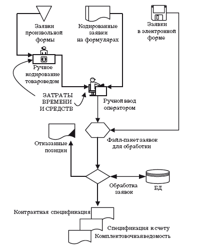 Третий метод организации обработки заявок основан на другом принципе реинжиниринга, который рекомендует: Обращайтесь с партнерами так, будто они являются частью вашего предприятия. Следующим шагом в сокращении потерь времени на обработку заявок и устранения ошибок в них является замена заявок постоянных заказчиков их электронными отчетами о наличии запасов товаров на складе. Поставщики анализируют остаток и расход товаров на складах заказчиков и направляют им предложения на поставку тоже в электронной форме. Получив подтверждение и корректировку предложений, поставщики отгружают товары. Например, региональные склады запасных частей компании “Volkswagen” ежемесячно сообщают логистическому центру компьютеру компании о наличии деталей на складе, о продаже за последние один, пять и пятнадцать месяцев. На основе этих данных поставщик рассчитывает потребность на соответствующий период и направляет предложение о поставке. Региональный склад обязательно корректирует его с учетом факторов рынка, не предусмотренных программами компьютера, и подтверждает отгрузку. Такой метод подготовки заявок вообще устраняет участие людей в обработке заявок у поставщиков. Тем самым соблюдается еще один принцип реинжиниринга: Как можно меньше людей должно быть вовлечено в процесс.