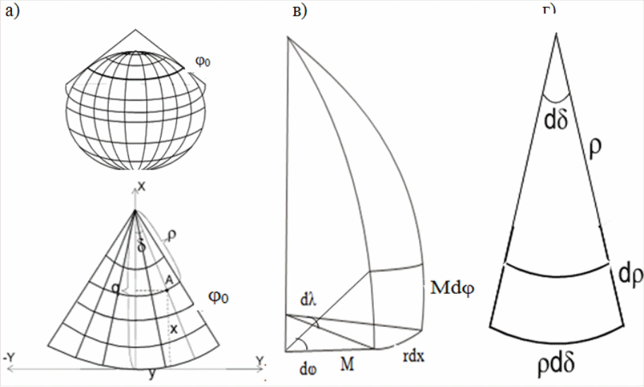 Как следует из рисунка 13б, связь прямоугольных и полярных координат узловых точек картографической сетки в этой проекции выражается формулами: