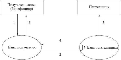 В системе кредитовых трансфертов (рис. 1.2) инициатором платежа выступает сам плательщик. По его приказу (1) банк плательщика посылает банку получателя распоряжение о кредитовании счета бенефициара и дебетовании своего корреспондентского счета в этом банке (2, 3). Участники оповещаются о проведенной операции (4–6). Таким образом, при кредитовом трансферте платежное поручение и денежная сумма движутся в одном направлении – от плательщика к получателю.