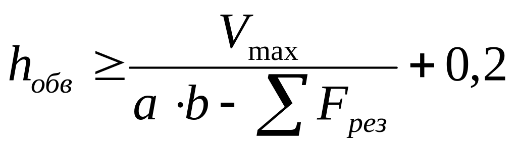 де Vmax – об’єм одного найбільшому резервуару в групі, м3; a і b – відповідно довжина і ширина обвалованої території, м; ΣFрез – сума площ основ усіх резервуарів, які знаходяться в обвалуванні, м2.