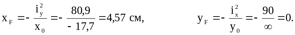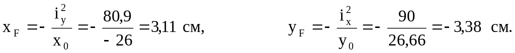 Строим ядро сечения. Для этого выбираем достаточное количество положений нулевой линии (с учётом симметрии сечения стойки), которые располагаем по касательным к контуру. В рассматриваемом примере имеется пять таких положений, показанных на чертеже. Каждому положению нулевой линии соответствует конкретная точка приложения силы (xF, yF), в то же время являющаяся точкой границы ядра сечения. Определим их координаты.