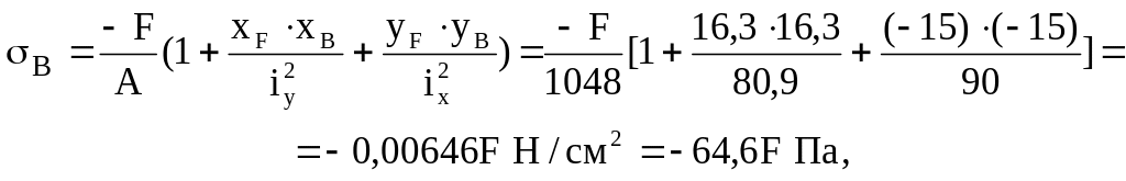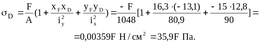 Знак минус перед F в формуле учитывает, что внецентренно приложенная сила является сжимающей. В точке В получено сжимающее, а в точке D – растягивающее напряжения, что соответствует условиям задачи.