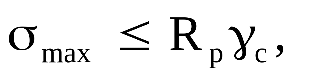 Заданы расчётные сопротивления бетона на растяжение и сжатие и геометрические размеры бруса. Необходимо определить грузоподъёмность, т.е. установить максимальное расчётное значение нагрузки. Для его вычисления воспользуемся условиями прочности бруса из хрупкого материала, имеющего разные расчётные сопротивления на растяжение (Rр) и сжатие (Rc).