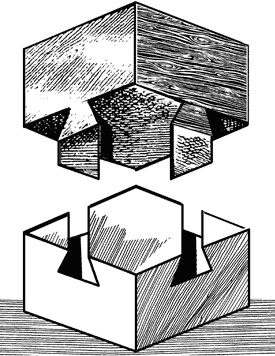 Все дело только в том, что выступы и углубления идут не крестом, как невольно кажется при рассматривании готовой вещи, а параллельно, в косом направлении. Такие выступы очень легко сбоку вдвинуть в соответствующие выемки.