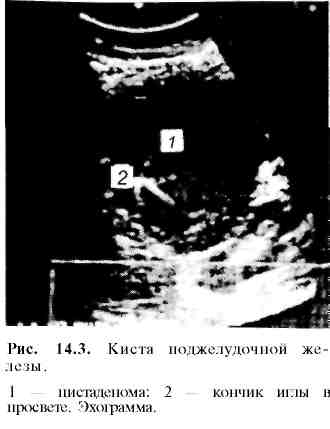 кисты могут быть с большой точностью визуализированы при ультразвуковом исследовании (рис. 14.3; 14.4; 14.5). К сожалению, возможности УЗИ нередко ограничены в связи с расположением перед поджелудочной железой раздутого газом и жидкостью, кишечника, закрывающего железу.
