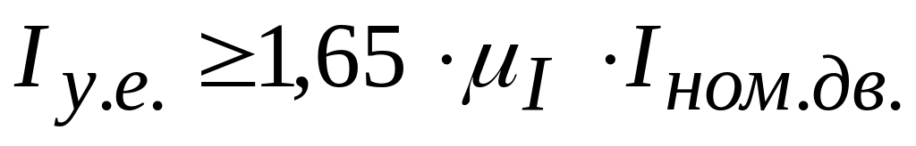 де Кз – коефіцієнт запасу, який враховує коливання напруги (беруть Кз = 1,1); Кр.у – коефіцієнт, що враховує неточність (розкид) за струмом спрацювання електромагнітних розчіплювачів, Кр.у ≈ 1,25; Кр.п – коефіцієнт, який враховує можливе відхилення пускового струму від його номінального значення, Кр.п = 1,2; µі – каталожна кратність пускового струму двигуна; Іном.дв – номінальний струм двигуна, А.