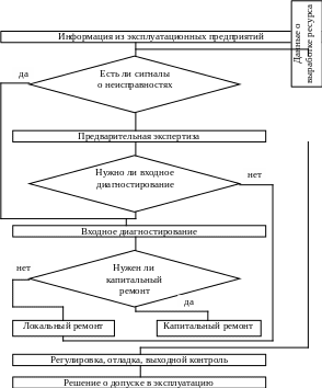 Структура прохождения изделия в ремонте при наличии непрерывного диагностирования показана рис. 42. Информация из эксплуатационных предприятий анализируется на наличие сигналов из лабораторий диагностики о неисправностях изделия. Если такие сигналы есть, то производят входное диагностирование изделия. Если сигналов нет, то проводят предварительную экспертизу для выявления целесообразности проведения входного диагностирования.