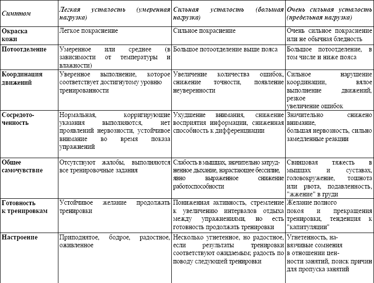 В повседневной практике величину внутренней нагрузки можно оценивать по показателям усталости, а также по характеру и продолжительности восстановления в интервалах отдыха между упражнениями (табл. №). Для этого используют такие показатели, как интенсивность потовыделения, цвет кожи, качество выполнения движений, способность к сосредоточению, общее самочувствие человека, его готовность продолжать занятия, расположение духа во время упражнений и в интервалах отдыха, а также показатели ЧСС во время упражнений и в интервалах отдыха. В зависимости от степени проявления этих показателей различают умеренные, большие и максимальные нагрузки.