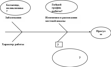 Простым и эффективным инструментом является причинно-следственная диаграмма (напоминающая рыбий скелет). Предположим, Вы столкнулись с проблемой прогулов. Причины проблемы - болезни, изменения в расписании занятий местной школы, монотонная работа, транспорт. Вы можете нарисовать «рыбий скелет», указать в его голове проблему, а на концах «костей скелета» - возможные причины (рис.6). Около каждой причины проблемы указывают возможные способы их устранения. Дополните рис.6 Другими причинами прогулов.