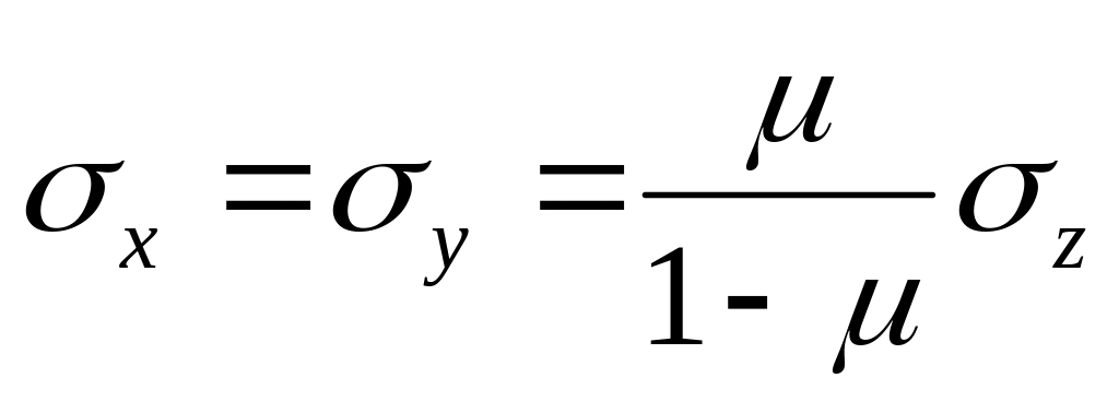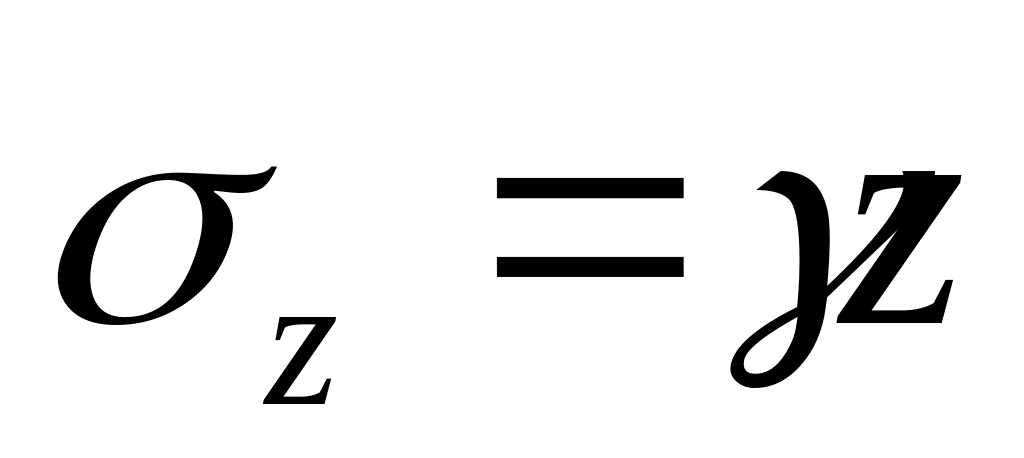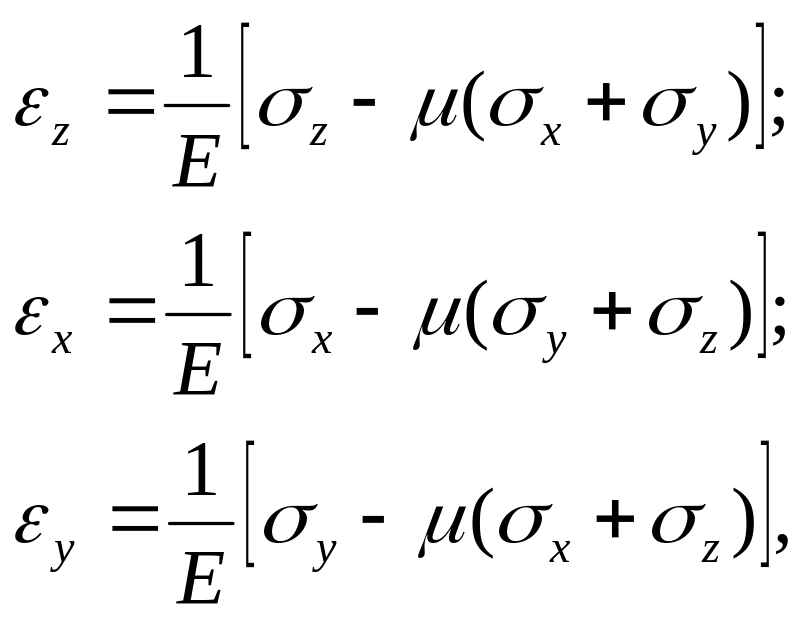 Рассмотрим напряженное состояние кубика породного массива, расположенного на глубине H = Z от поверхности (рис.14). Обозначим вертикальное напряжение σz и горизонтальные – σx и σy. Тогда относительные деформации кубика можно выразить в виде