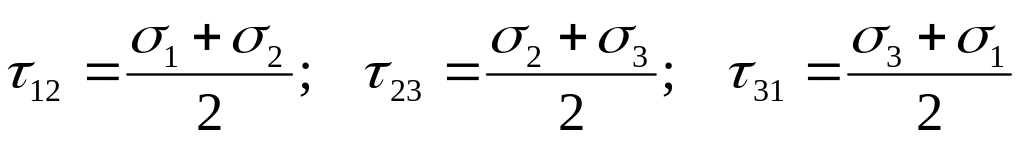 В теории упругости доказывается, что для любой точки тела, при любом напряженном состоянии имеются три взаимно перпендикулярные плоскости, на которых касательные напряжения отсутствуют. Нормальные напряжения на этих площадках называются главными нормальными напряжениями и обозначаются σ1, σ2, σ3, причем σ1> σ2> σ3, Нормали к указанным площадкам называются главными осями напряжений и обозначаются соответственно 1, 2, 3. Касательные напряжения на площадках, делящих пополам угол между главными осями, называются главными касательными напряжениями и обозначаются (рис. 13)