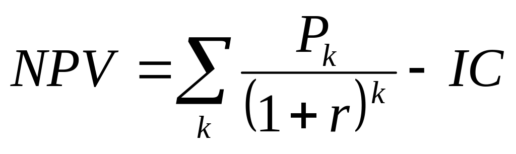 Припустимо, робиться прогноз, що інвестиція (IC) буде генерувати протягом n років, річні прибутки в розмірі P1, P2, ., Рn. Загальний накопичений розмір дисконтированих прибутків (PV) і чистий приведений ефект (NPV) відповідно розраховуються по формулах: