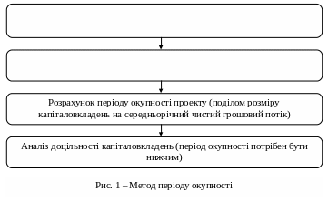 Деякі фахівці при розрахунку показника PP усе ж рекомендують враховувати тимчасовий аспект. У цьому випадку в розрахунок приймаються грошові потоки, дисконтовані по показнику «ціна» авансованого капіталу. Очевидно, що термін окупності збільшується. Розрахунок та аналіз капіталовкладень за даним методом надано на рис. 1.