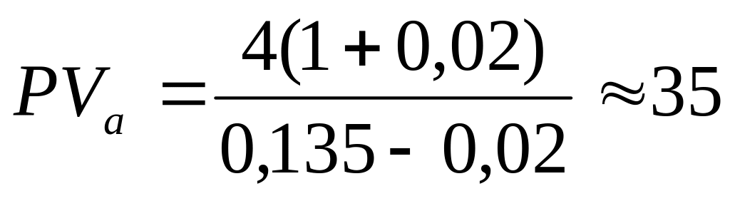 Приклад. Коефіцієнт акцій компаній β = 1,5. Середня дохідність ринку акцій за індексом Доу–Джонса — 12 %. Дохідність державних облігацій — 9 %. Щорічний приріст дивідендів — 2 %. У наступному році очікується дивіденд 4 дол. на акцію. Визначити теперішню ціну акції.