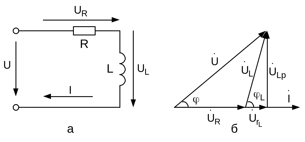 Рисунок 3.8 - Схема (а) и векторная диаграмма (б) цепи с последовательным соединением резистора и катушки индуктивности