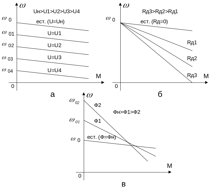 Рисунок 6.4 - Механические характеристики двигателя независимого возбуждения при регулировании скорости за счет изменения питающего напряжения (а), реостатном регулировании (б) и регулировании за счет ослабления магнитного потока (в)