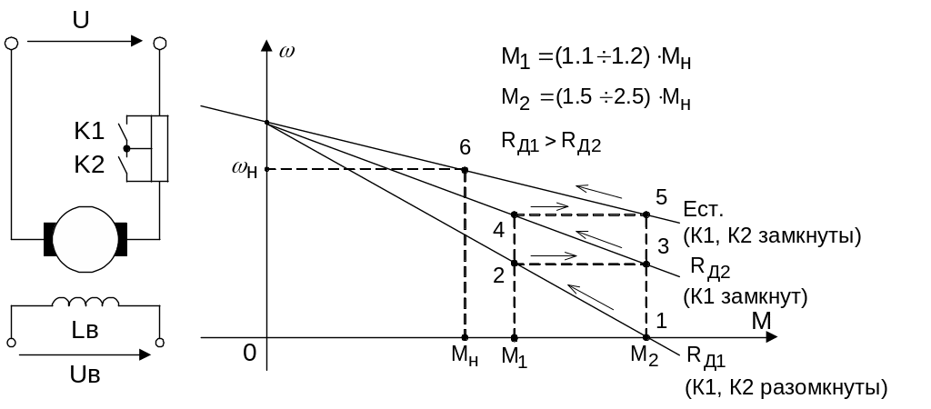 По мере увеличения скорости возрастает противо-ЭДС и уменьшается ток в якоре и момент. Когда электромагнитный момент на валу станет равен моменту сопротивления, возрастание скорости прекратится. Если теперь снова уменьшить сопротивление реостата, возрастет ток и вращающий момент и двигатель продолжит разгон. Для уменьшения времени пуска двигателя и уменьшения бросков тока пусковой реостат обычно имеет несколько ступеней, которые последовательно выводятся из цепи. На рисунке 6.3 показана схема включения и механические характеристики при реостатном пуске двигателя независимого возбуждения в три ступени.