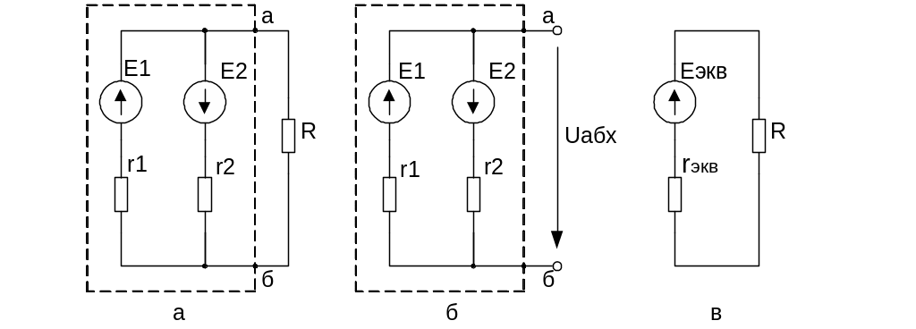 В результате схема может быть представлена в виде эквивалентного генератора с параметрами и и присоединенного к этому генератору сопротивления R (рисунок 2.11 в).