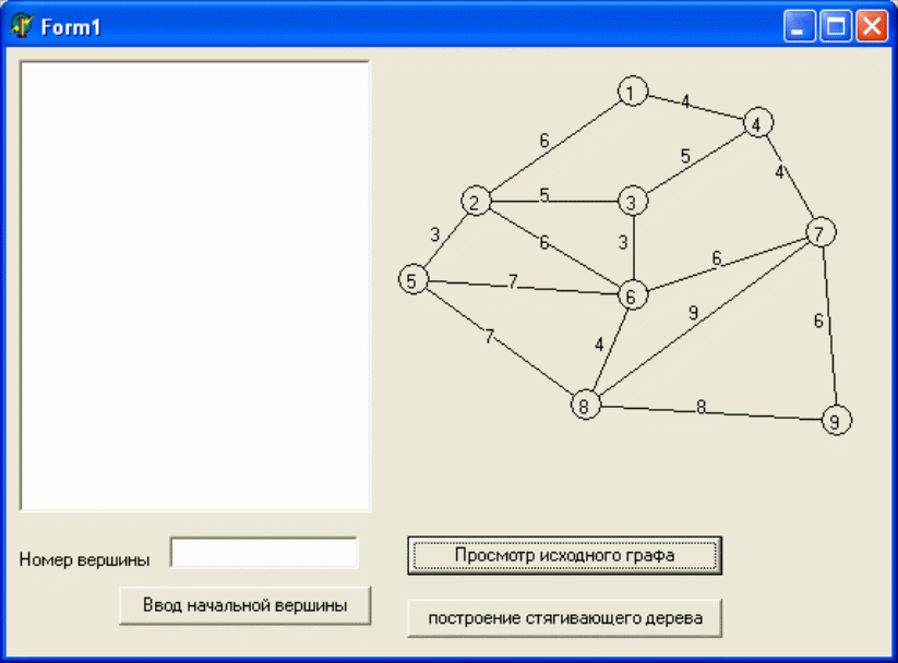 В качестве исходного графа для программной реализации задачи построения стягивающего дерева связанного графа, выбран граф, для которого уже существует программная реализация в визуальной среде программирования Delphi (граф изображен на рисунке 6.3).