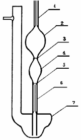 1 – узкое колено; 2 – верхний объем; 3 – верхняя риска; 4 – средний объем; 5 – нижняя риска; 6 – капилляр; 7 – нижний объем.