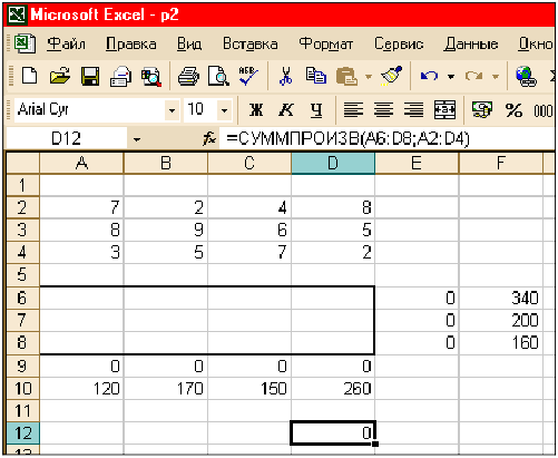 В ячейках, обведённых жирной рамкой, получено оптимальное решение транспортной задачи, а именно, план поставок X2. В ячейке D12 находится минимальное значение целевой функции: