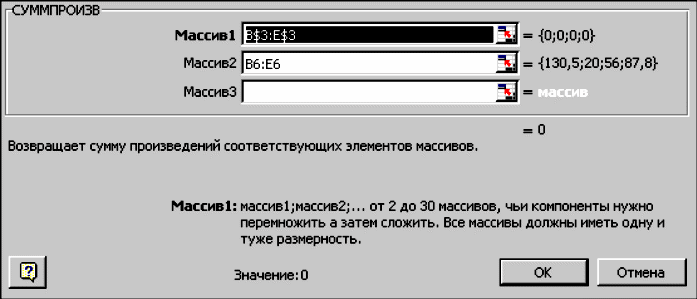 после ввода ячеек в строки Массив 1 и Массив 2 в окне СУММПРОИЗВ появятся числовые значения введенных массивов (см. рис. 4.3), а в экранной форме в ячейке F6 появится текущее значение, вычисленное по введенной формуле, то есть 0 (так как в момент ввода формулы значения переменных задачи нулевые).