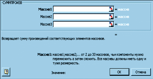 2.1.7. Заполнить диалоговое окно для функции СУММПРОИЗВ.