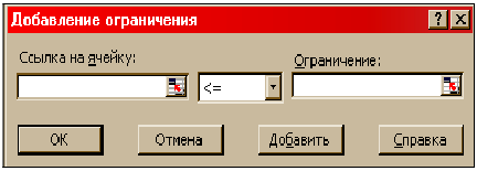 Для приведения в рабочее состояние математической программы поиска оптимального решения заданной задачи необходимо установить ограничения, учитываемые при её решении. Для этого нажимаем на кнопку Добавить, расположенную справа от поля Ограничения. На экране появляется следующее окно (рис. 1.8).
