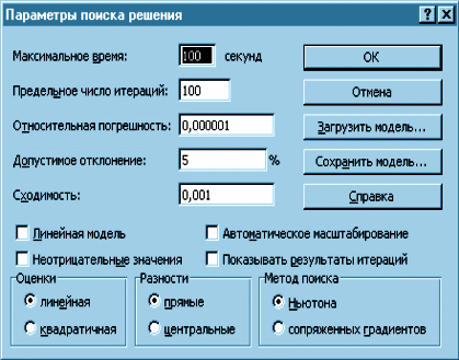 Нажимаем на кнопку Параметры. Вместо предыдущего окна появится окно Параметры поиска решения, позволяющее выбрать параметры математического метода поиска решения; если есть необходимость в знании промежуточных результатов вычислений при поиске оптимального решения, нужно отметить пункт Показывать результаты итераций в открывшемся окне (рис. 1.5). В Excel в качестве методов поиска решения задачи предлагаются метод Ньютона и метод сопряженных градиентов. Для решения задач линейного программирования обычно используется метод Ньютона. Предельное число итераций, относительная погрешность и допустимое отклонение выбираются соответствующими той задаче, оптимальное решение которой находится. Максимальное время назначается по опыту решения аналогичных задач на используемом компьютере. Показанные установки в окне Параметры поиска решения на рис. 1.5, как правило, оказываются достаточными для получения оптимального решения задач линейного программирования.